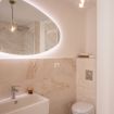 The room also features a spacious private bathroom, elegant and simple in its lines.