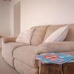The living area is bright and welcoming, with a fully equipped kitchen, a dining table for four, and a cozy sofa, perfect for relaxing after dinner or during a quiet afternoon.