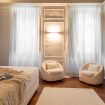 Its elegance is both simple and refined. Two large windows overlook the streets of Florence, filling the room with natural light all day long. At their base, two comfortable armchairs create an airy, relaxing corner — perfect for reading or simply having a quiet chat.