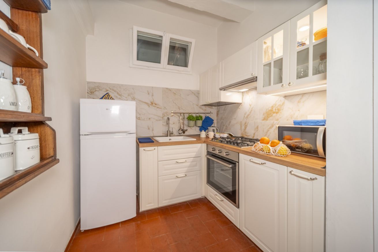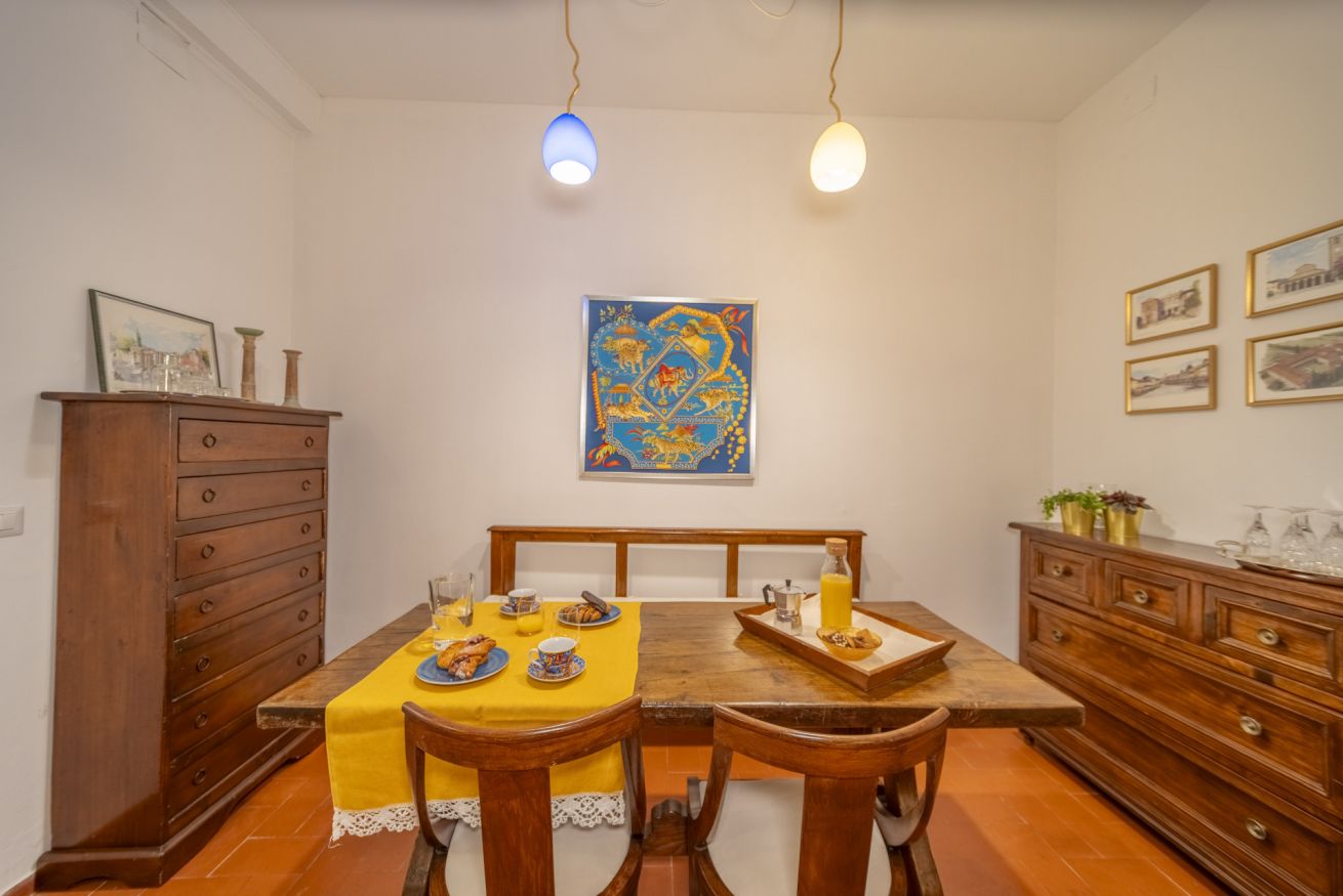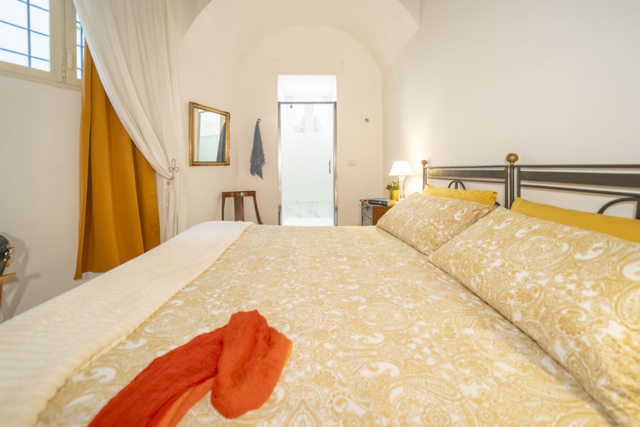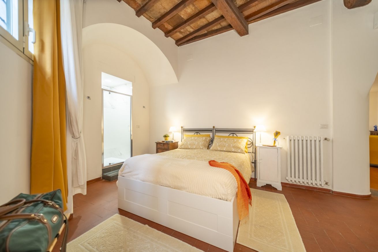 In questo appartamento spazioso e curato vi accoglierà subito un comodo soggiorno, arredato con toni caldi che completano il pavimento in cotto, mobili antichi e oggetti di design unici: qui potrete rilassarvi nel salottino dopo una lunga giornata di esplorazione, o concedervi una cena tranquilla nella zona pranzo. Subito accanto troverete la cucina, moderna e completamente accessoriata, e la splendida camera da letto, con il soffitto di travi a vista e il comodissimo letto matrimoniale, oltre ad una doccia aggiuntiva. A vostra disposizione, anche un delizioso bagno appena rinnovato e un bagnetto di servizio.