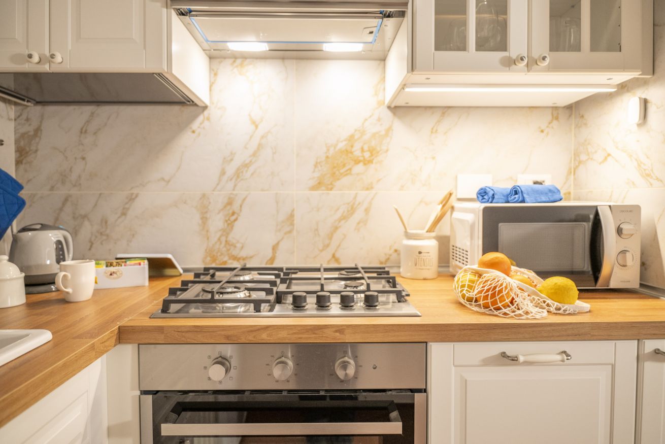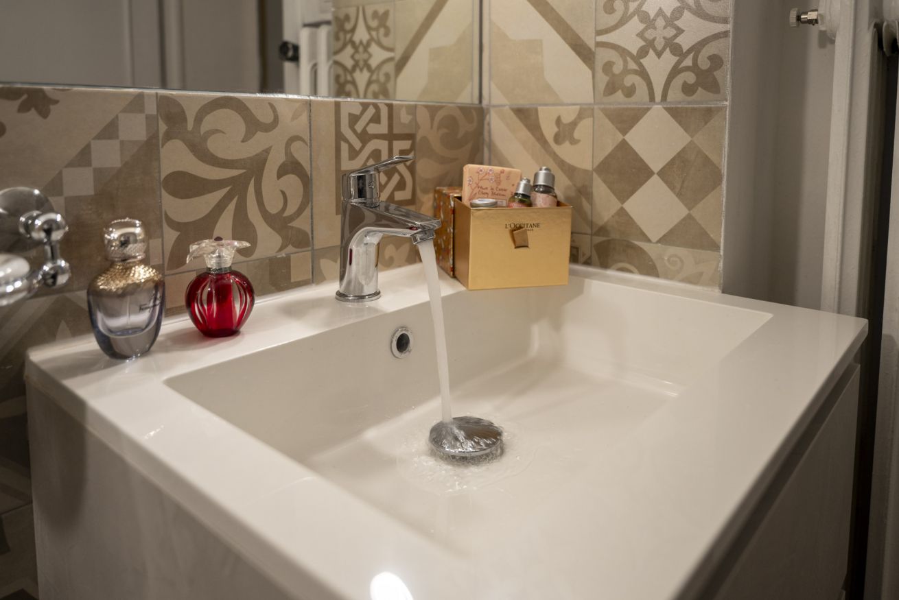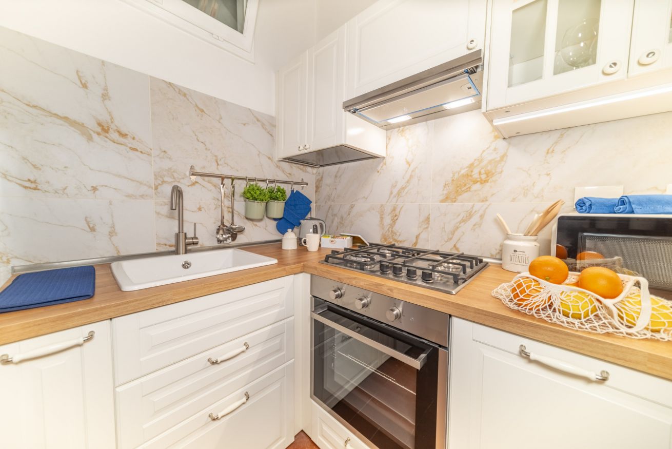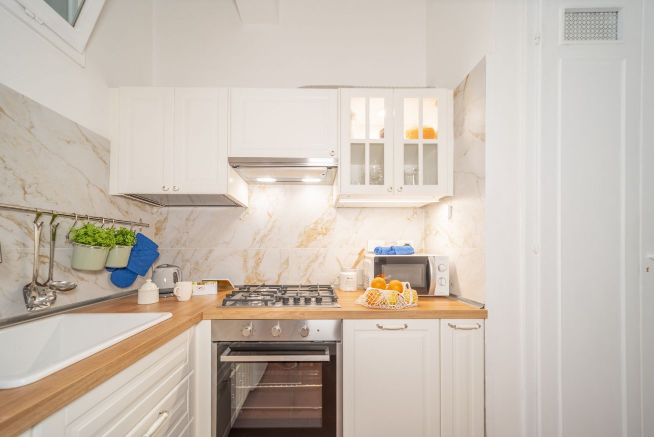 In questo appartamento spazioso e curato vi accoglierà subito un comodo soggiorno, arredato con toni caldi che completano il pavimento in cotto, mobili antichi e oggetti di design unici: qui potrete rilassarvi nel salottino dopo una lunga giornata di esplorazione, o concedervi una cena tranquilla nella zona pranzo. Subito accanto troverete la cucina, moderna e completamente accessoriata, e la splendida camera da letto, con il soffitto di travi a vista e il comodissimo letto matrimoniale, oltre ad una doccia aggiuntiva. A vostra disposizione, anche un delizioso bagno appena rinnovato e un bagnetto di servizio.