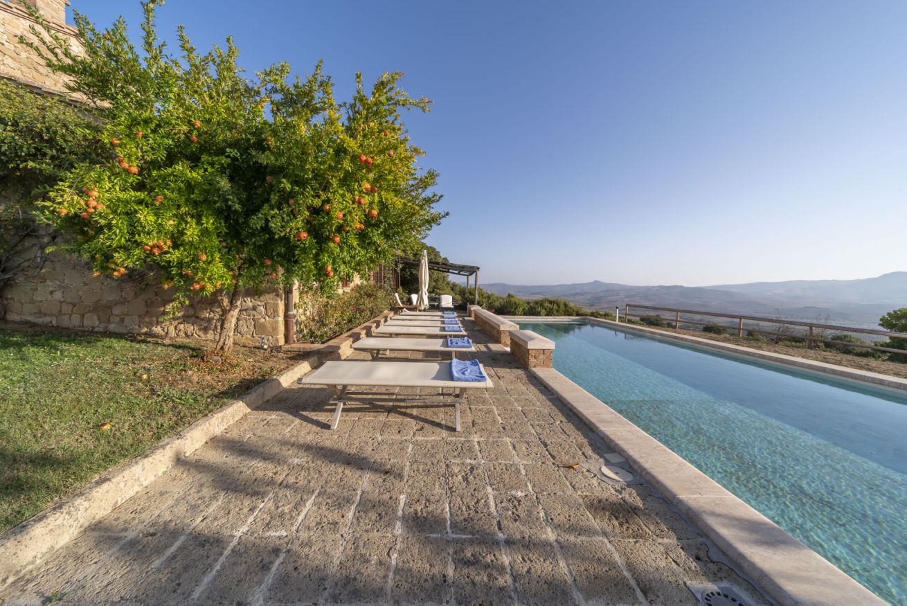 The estate, renovated to revive its ancient splendor while maintaining its distinctive atmosphere, can accommodate up to 10 guests: with six bright and comfortable bedrooms, each with a large private bathroom, it will be the ideal place to unwind. You can then spend time in the wonderful lounges, spacious and welcoming, delight in replicating your favorite recipes in the large kitchen, and dine outdoors under the pergola, on the covered terrace with breathtaking views of the hills, or in the dining room overlooking the pool exclusively at your disposal.